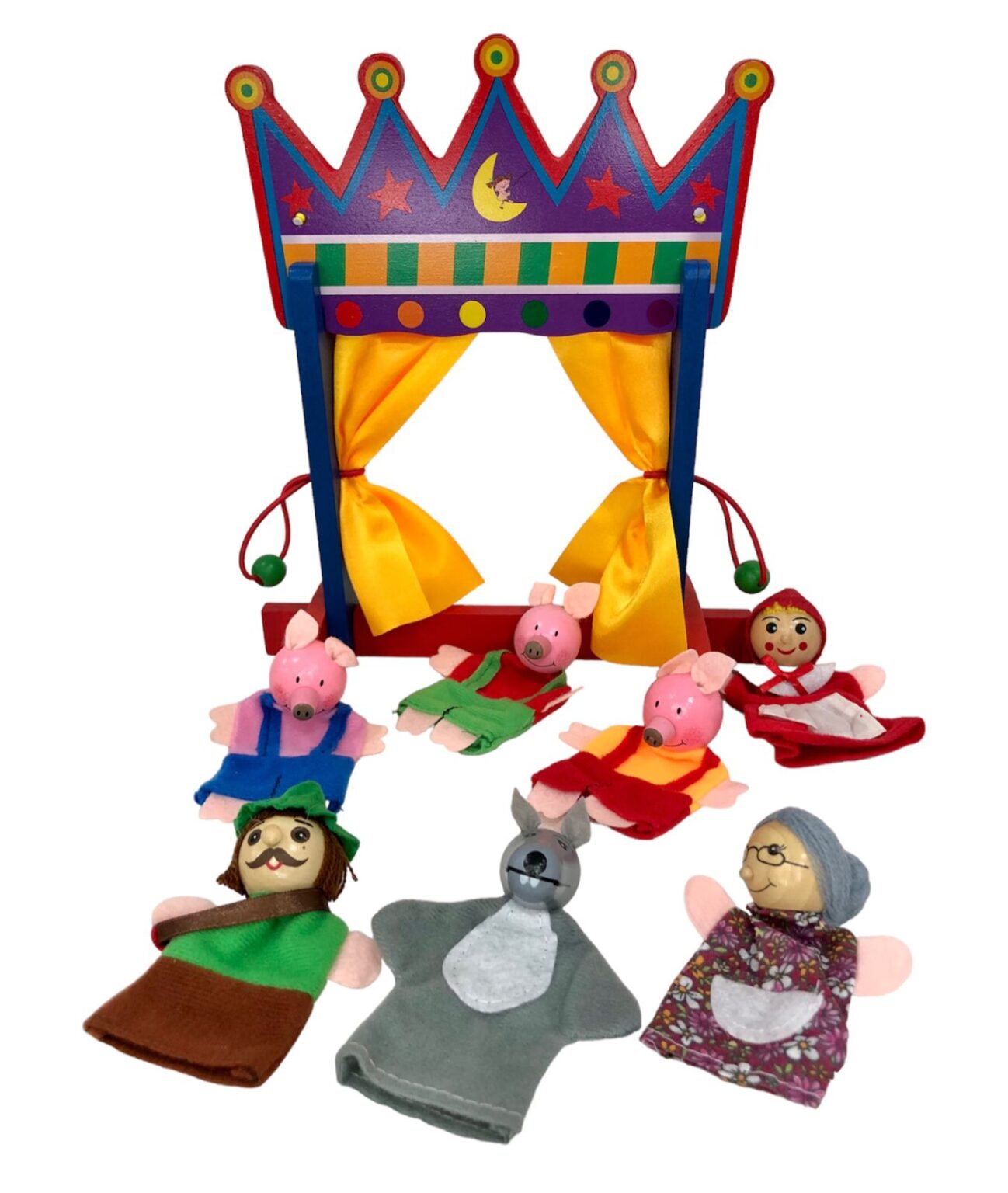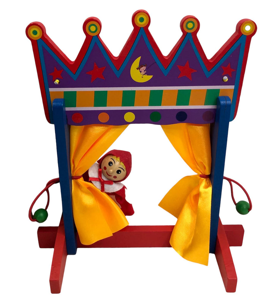 Se suministra completo con siete marionetas de dedo temáticas, hay un castillo de colores brillantes que rodea el escenario y cortinas realistas.