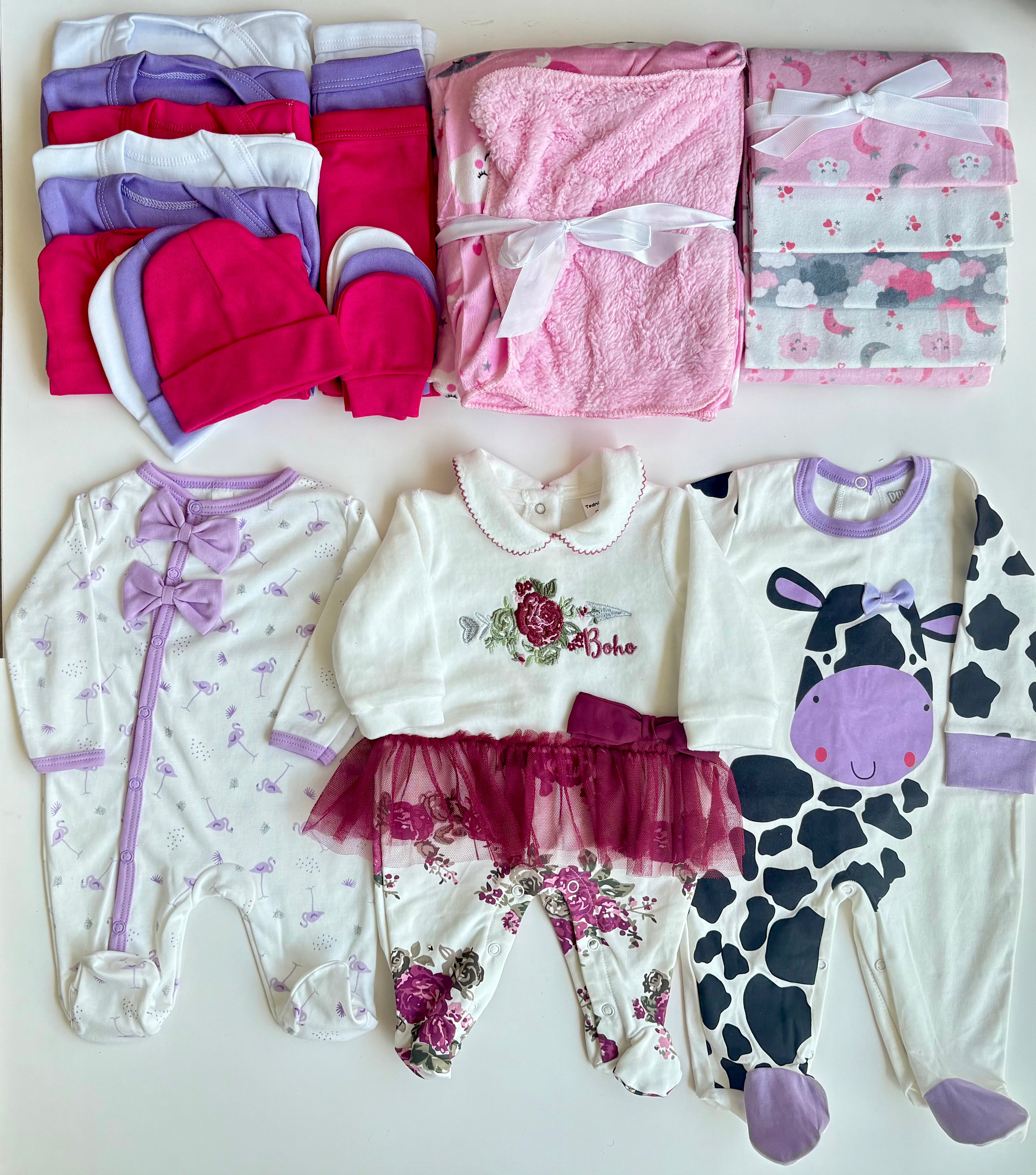 3 Bodys manga larga 3 Camisetas manga larga 3 Gorros 3 Pantys 3 pares de mitones 3 ositos o conjuntos 4 tutos de algodón afranelado 76×76 cm 1 mantita para salida 100x80 cm Ositos sujeto a disponibilidad de modelos. Una vez realizada la compra, contáctanos vía WhatsApp para que puedas escoger los modelos🌈